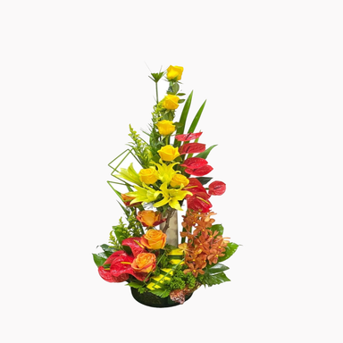 Deze magische mix van luxe rode, gele en oranje bloemen barst van de kleur, textuur en persoonlijkheid. Het is een tropische traktatie die de ontva...