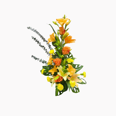 Dit bloemstuk loopt over van elegantie en energie en is de ideale manier om uw dierbare te eren. Gebruikte bloemen:Anthuriums LeliesOrchideenRozen