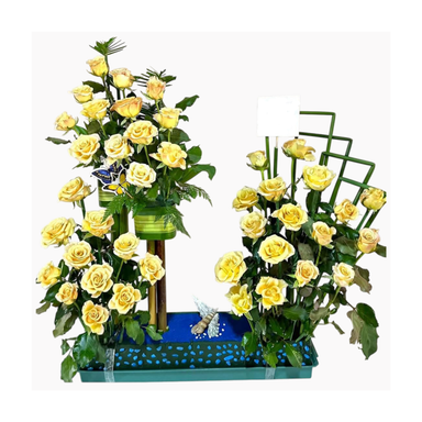 Met dit mooie en smaakvolle geel/witte rouwstuk laat je jouw zorgzame en respectvolle medeleven blijken.. Gebruikte bloemen:LeliesOrchideeënRozen