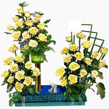 Alle gegevens bekijkenMet dit mooie en smaakvolle geel/witte rouwstuk laat je jouw zorgzame en respectvolle medeleven blijken.. Gebruikte bloemen:LeliesOrchideeënRozen